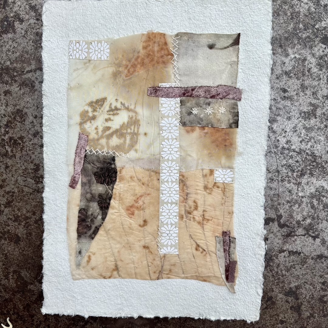 Die Seiden- oder Wollstoffe sind mit Naturpigmenten oder mit den Farben und Formen der Blätter gefärbt. Kombiniert mit schönen Papieren oder Fundstücken wurden sie zu einem neuen Ganzen zusammengefügt und mit Hand bestickt. Die Collagen strahlen Poesie, Zartheit und Harmonie aus.