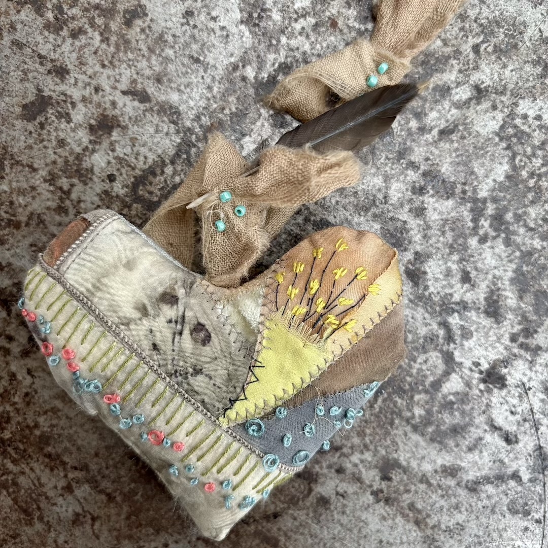 Die textilen Herzen sind mit Naturpigmenten gefärbt und liebevoll von Hand bestickt. Mit einem Band zum Aufhängen versehen und mit einer gefundenen Feder aus dem Wald geschmückt.